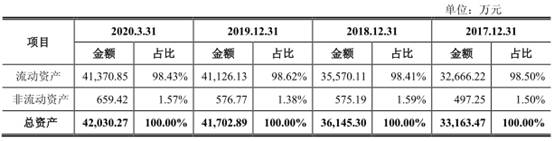 凯淳股份为非生产性企业,属于轻资产公司。2017年至2020年3月31日,公司总资产分别为3.32亿元、3.61亿元、4.17亿元、4.20亿元。