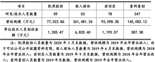 截至2020年3月末,凯淳实业共有技术研发人员59人,丽人丽妆、若羽臣、壹网壹创技术研发人员数量分别为53人、78人、247人。