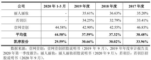2017年至2020年1-3月,凯淳股份综合毛利率呈下滑趋势,分别为33.96%、30.02%、30.66%和29.59%,小幅下降。
