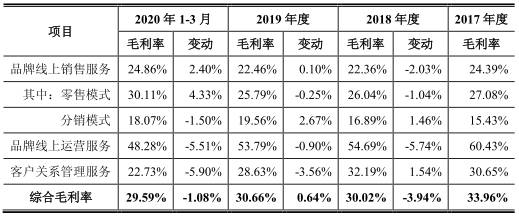 其中,品牌线上运营服务毛利率报告期内连续下滑,分别为60.43%、54.69%、53.79%、48.28%。