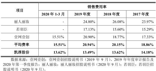 2017年至2020年1-3月,凯淳股份销售费用分别为7909.52万元、1.02亿元、1.04亿元、2283.22万元。销售费用率分别为14.18%、13.62%、13.49%和13.62%,同行业可比公司销售费用率分别为18.86%、20.15%、20.94%、15.51%。