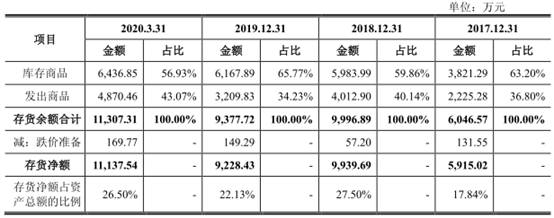 2017年至2020年3月31日,凯淳股份存货金额分别为5915.02万元、9939.69万元、9228.43万元、1.11亿元,占资产总额的比例分别为17.84%、27.50%、22.13%、26.50%。