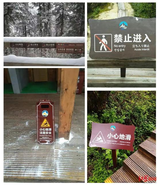 来自黄龙景区消息,整个景区的游览栈道绝大部分安装了护栏,并在游客容易偏离游览线路的点位设置了“禁止进入”的警示标牌和“请勿翻越护栏”“小心路滑、注意安全”等温馨提示标语,提醒游客在游览过程中全程不得离开游览栈道,从而有效规范游客安全文明出行行为。