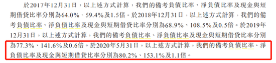 招股书显示,截止2020年5月31日,领地控股剔除预收款的资产负债率为80.2%,净负债比率为153.1%,现金短债比为1.1倍。