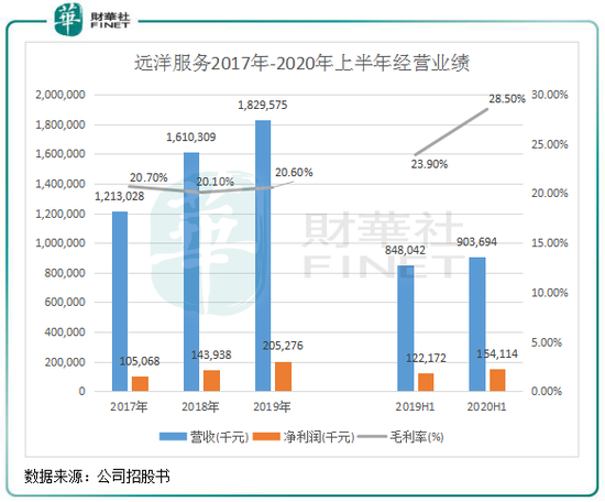 依赖远洋集团充血的远洋服务在管建筑面积增长速度在过去几年并不快,那么也反应在了其业绩层面。2017年-2019年,远洋服务营业收入分别为12.13亿元、16.10亿元及18.29亿元,复合年增长率为22.79%;净利润分别为1.05亿元、1.43亿元及2.05亿元,复合年增长率为39.73%。