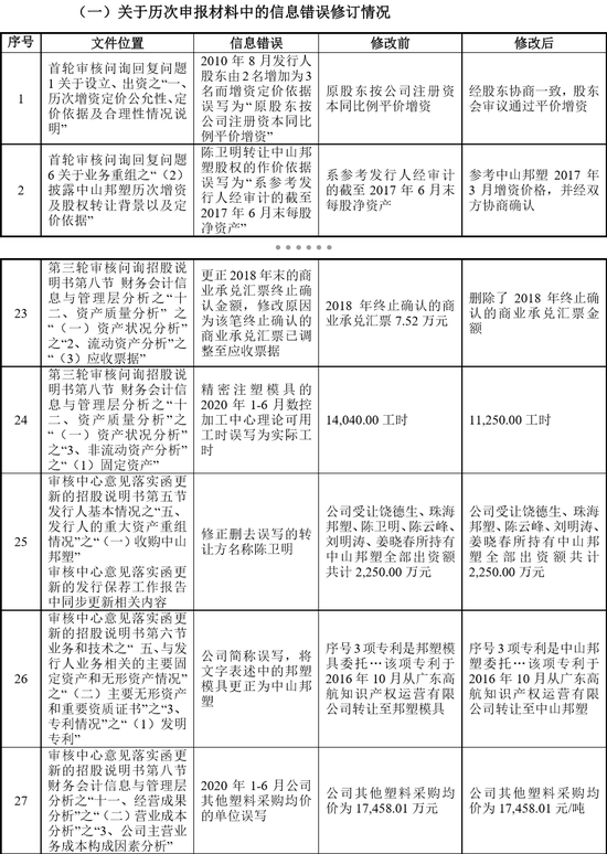 记者注意到,奇德新材的保荐机构为东莞证券,会所和律所分别为信永中和会计师事务所(特殊普通合伙)以及广东信达律师事务所。《回复》中披露的历次申报材料的的信息错误修订多达27次,历次申报材料中数据错误修订情况汇总成的表格在《回复》中占了整整两页。