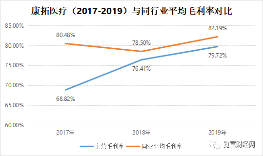 除了产品单一带来的风险之外,康拓医疗还存在毛利率明显低于行业水平的问题。公开数据显示,在2017年至2019年度,康拓医疗的主营业务毛利率分别为68.82%、76.41%和 79.72%,但可比的同行业上市公司的平均毛利率却达到了80.48%、78.5%、82.19%。