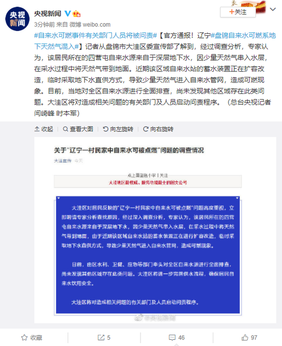 原标题:官方通报!辽宁盘锦自来水可燃系地下天然气混入