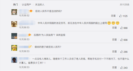 有微博网友表示,拒收人民币不是违法的吗?后有网友跟评,一点没有人情味儿,随便来个工作人员收了老人的钱,帮她手机支付一下不就行了,也不是什么大事儿,能费多少工夫?