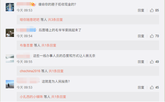 还有微博网友表示,这些一线办事人员的态度和方式让人很无奈,后面的“为人民服务”非常讽刺。