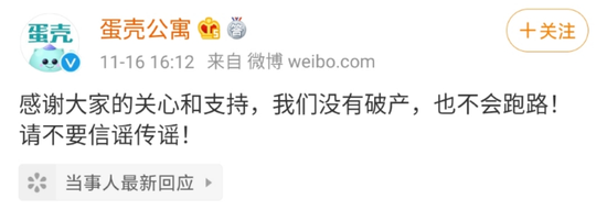 虽然蛋壳公寓已在官方账号上承诺,“没有破产、不会跑路”。