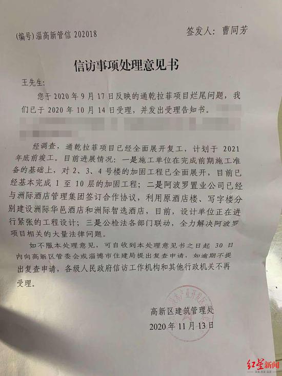 ▲11月13日,淄博市高新区建筑管理处书面回复业主称,该项目已全面复工,计划2021年底前竣工