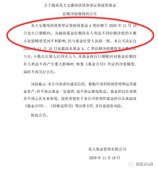 11月19日,英大基金发布关于提高英大安惠纯债债券型证券投资基金份额净值精度的公告称,英大安惠纯债基金A类份额于2020年11月18日发生巨额赎回。为确保基金份额持有人利益不因份额净值的小数点保留精度受到不利影响,经与基金托管人协商一致,公司决定自2020年11月18日起提高本基金A、C类份额净值精度至小数点后八位,小数点后第九位四舍五入。