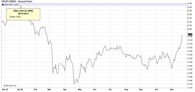即将在2个月到期和3个月后到期的布伦特期货合约的价差走势图也呈现类似的情况。