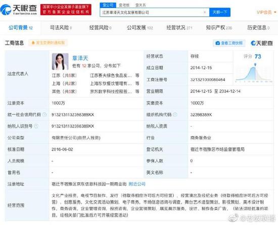 江苏章泽天文化发展有限公司成立于2014年12月15日,法定代表人为章泽天,注册资本为1000万,经营范围包含文化产业投资,电视节目制作、发行,经营演出及经纪业务等。该公司由章泽天全资控股。