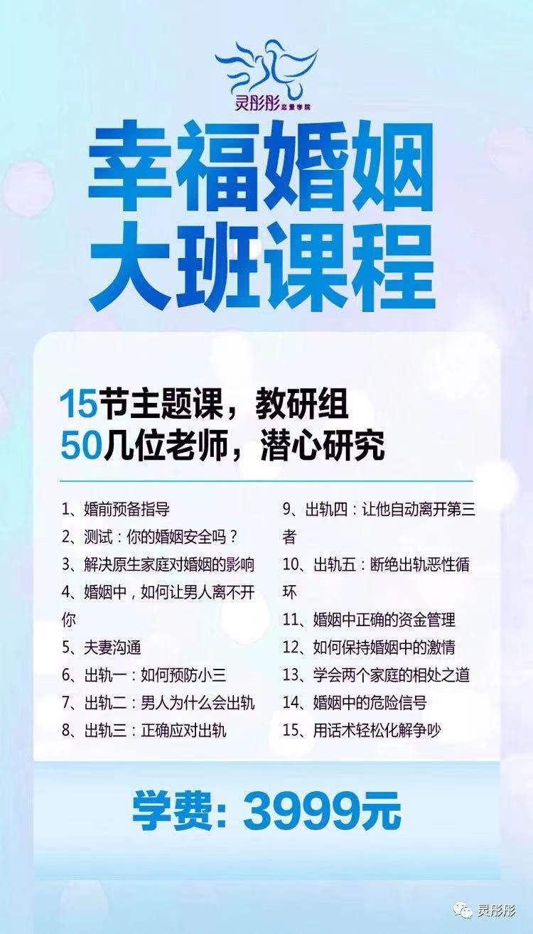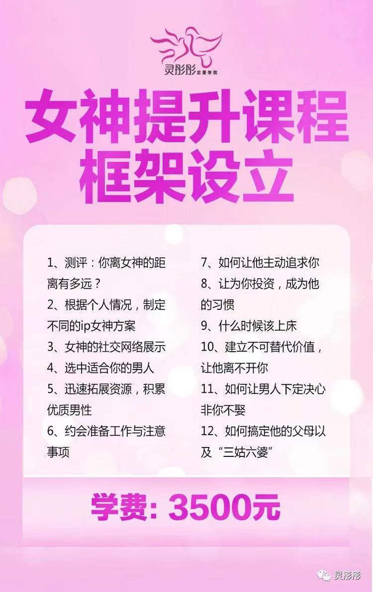 根据微信公众账号“灵彤彤”发布的海报招生信息与课程信息,澎湃新闻注意到,今年6月5日,该微信公众账号发文称,“灵彤彤恋爱学院”的课程升级,升级后的课程包括价值3500元3个月的女神养成课程,价值3999元3个月的分手挽回课程和价值3999元3个月的完美婚姻课程。