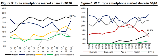 小米的手机业务分区域来看,根据Canalys,小米Q3在国内市场份额提升至12.6%、稳居第四;在西欧出货量同比增长107.3%,市场份额提升至13.3%、排名第三;在中东欧市场份额提升至26.9%、排名第二;在拉美、中东、非洲市场高速增长,市场份额分别提升至9.0%、17.4%、10.7%,排名均在前四。