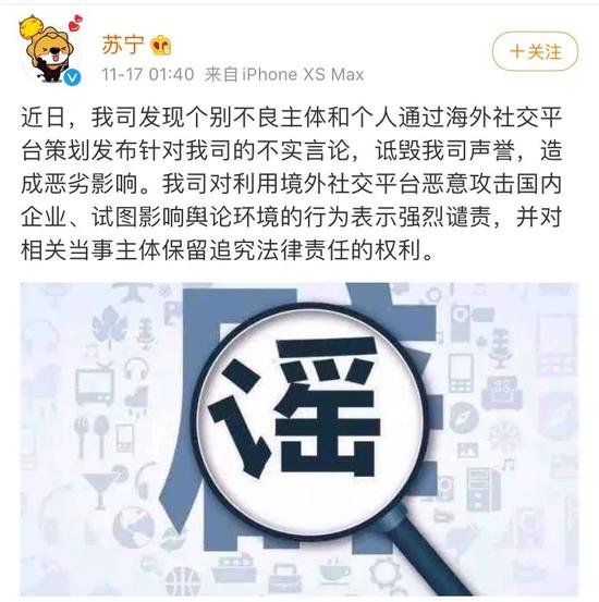 11月17日凌晨1点40分,苏宁在其官方微博发布一则语焉不详的消息,疑似对近期市场传言作出回应,表示“强烈谴责不实言论”。