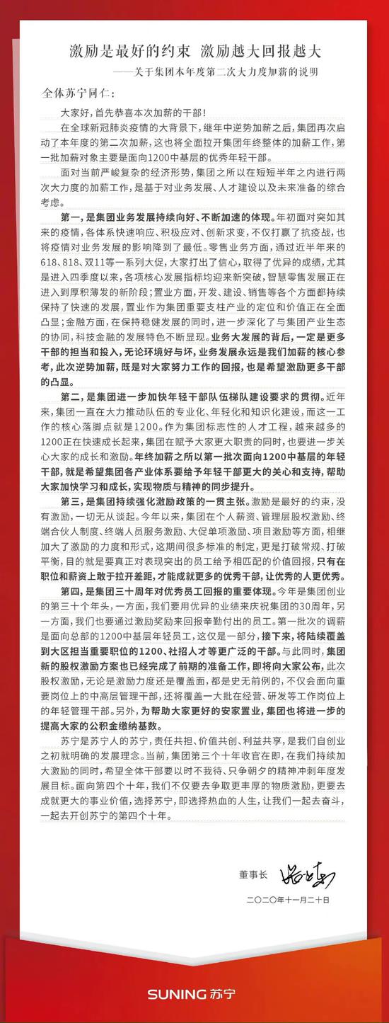 11月20日,苏宁易购宣布本年度第二次大幅涨薪,受到市场广泛关注。分析人士认为,苏宁易购年内两度加薪,展示了其近期业务发展的向好,以及较为雄厚的资金实力。