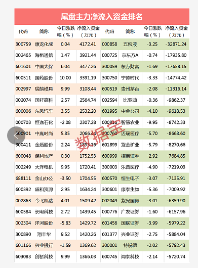 5股尾盘流出资金超亿元,其中五粮液大幅流出3.29亿元,京东方A、东方财富、宁德时代、贵州茅台流出额分别均超亿元。