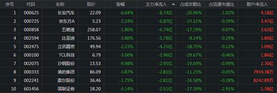 长安汽车、京东方A、五粮液分别遭主力资金卖出8.74亿元、6.87亿元、6.74亿元。