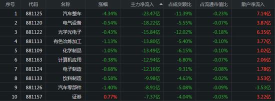 主力资金流出的板块分别是汽车、电气、光电,主力资金流出金额分别为23.47亿元、18.22亿元、15.84亿元,其中散户净流入金额为7.41亿元、3.87亿元、6.35亿元。