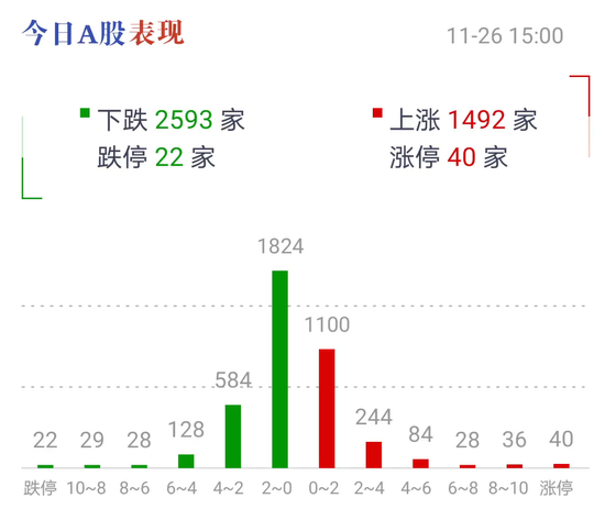 全天下跌的个股2593家,上涨1492家,涨停40家。