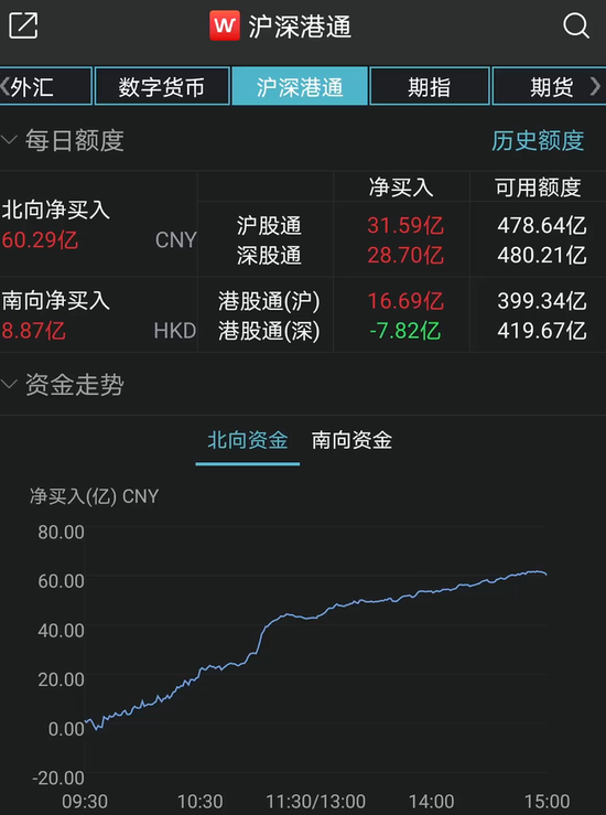 Wind数据显示,北向资金全天实际净买入60.29亿元,其中沪股通净买入31.59亿元,深股通净买入28.7亿元。