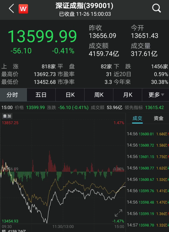 今天,三大指数下探回升。截至收盘,沪指微涨0.22%,报收3369点;深成指跌0.41%,报收13599点;创业板指跌0.23%,报收2609点。