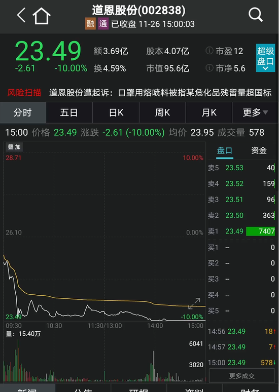 截至收盘,封死跌停板,股价23.49元每股,市值95.6亿元。