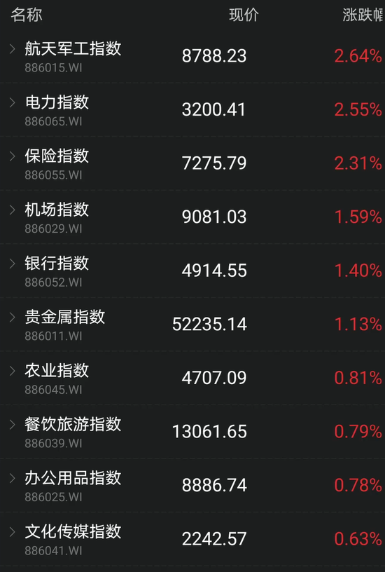 从指数表现来看,航天军工指数、电力指数、保险指数涨超2%,银行指数也涨1.4%,酒店餐饮等板块涨幅居前。