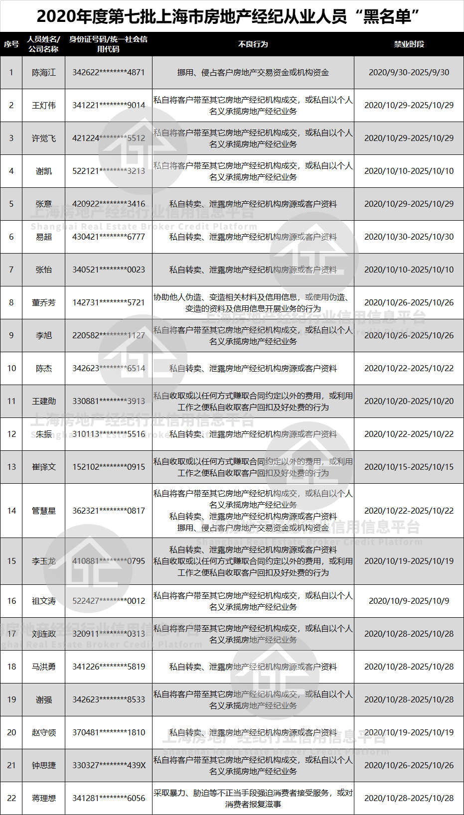 11月26日,上海市房地产经纪行业协会自律专业委员会通过微信公号“上海市房地产经纪行业诚信平台”,公示了2020年度第七批上海市房地产经纪从业人员“黑名单”,共涉及22人。至此,被列入“黑名单”的上海市房地产经纪从业人员已达280人。