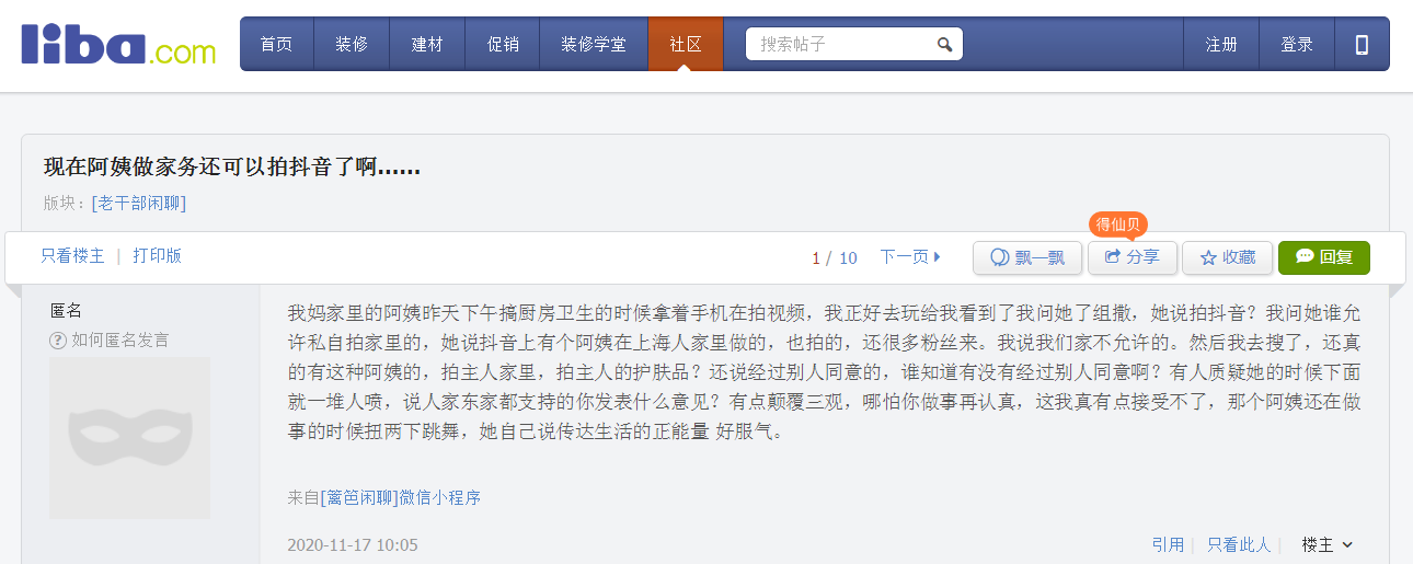 还有网友认为,钟点工按时间收费,在工作时间拍抖音不合适。另外,拍雇主家的视频发到抖音上涉嫌侵犯雇主隐私。