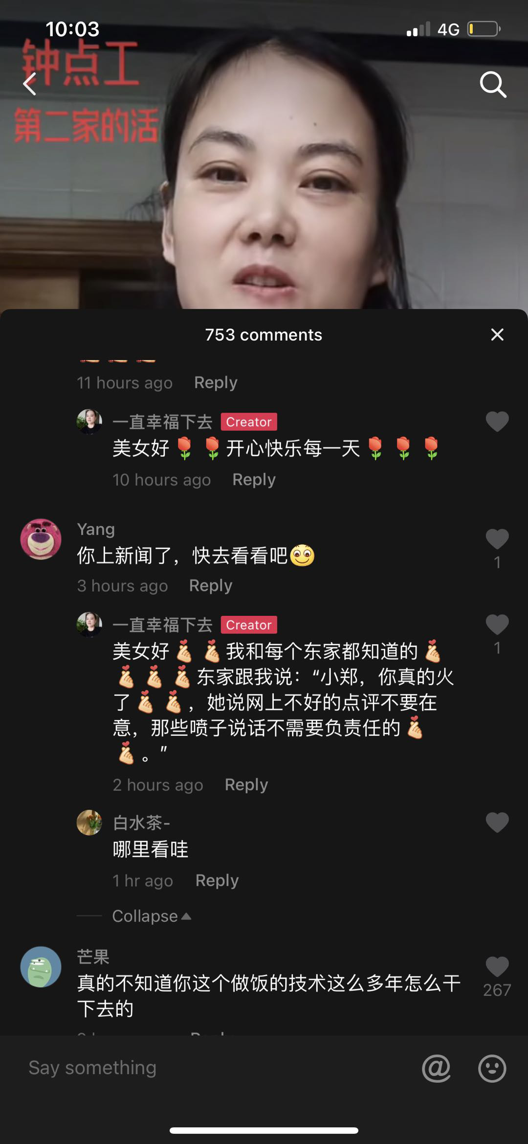 在大部分视频下,记者发现网友的留言互动都集中于咨询饭菜的做法、清洁物品的使用方式等。在该抖音号10月25日发布的一条视频中,“一直幸福下去”标注了这是“第一次和东家合作完成的视频,她把下午做好的烤鸡图片和视频发给我,我再把刚开始拍的合起来剪辑”。
