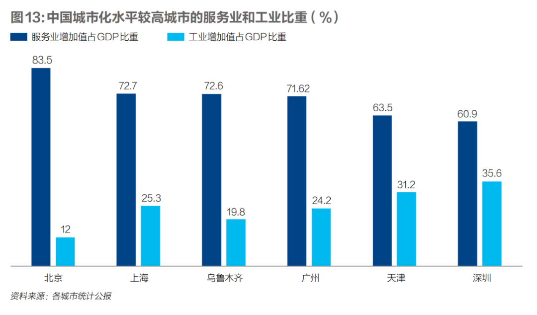 就中国而言,虽然总体上服务业增加值占比刚刚超过了工业增加值占比,但是一些城市化水平较高、人均预期寿命已接近发达国家水平的城市,服务业的比重其实已经大大超过了工业。比如,北京服务业增加值占比超过了80%,上海不到72.7%,均远超出工业增加值占比,广州、深圳、天津等城市也是如此,它正在接近发达国家的产业结构(见图13)。