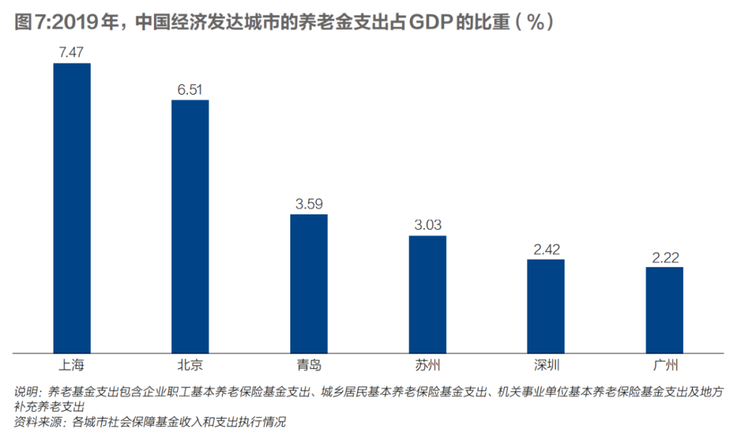 虽然一些国家和地区都已基本进入了中度老龄化社会,但是在养老金支出占GDP比重方面差异很大。法国、日本、德国的比重最高,也是老龄化最突出的国家,而英国和美国居中。而东亚地区的韩国以及中国台湾和中国香港,养老金占GDP比重都较低,甚至只有北京和上海的二分之一(见图7)。由此看来,其实还是有值得借鉴的案例。