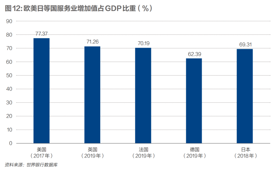 如今,服务业逐渐替代工业和农业,已经成为发达国家的主导产业。伴随着城市化进程的提高,以知识和技术为主导的服务业取代以体力劳动为主导的工业和农业是大趋势。发达国家服务业增加值占国民经济的比重已经达到了70%-80%(见图12)。