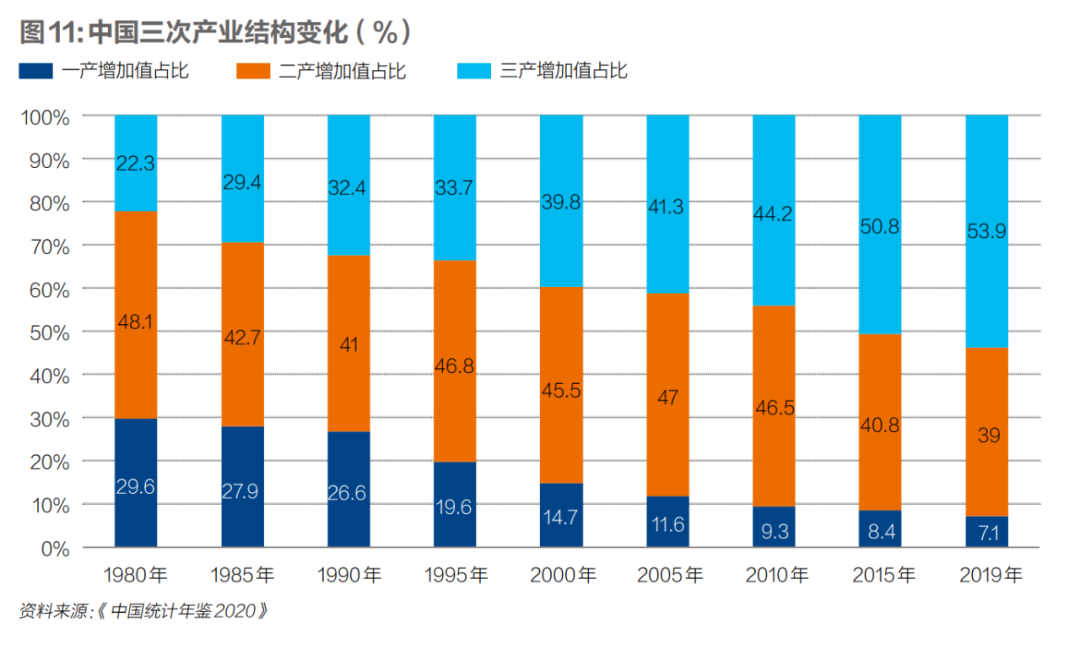 传统工业和农业为主导产业的时代。与体力劳动相关的产业就是传统的工业和农业。在工业和农业没有实现机械化和自动化的时代,最需要的是体力劳动者。回溯到改革开放前,或者改革开放后的20年,中国的工业和农业在国民经济中仍然占有较高的比重(见图11)。