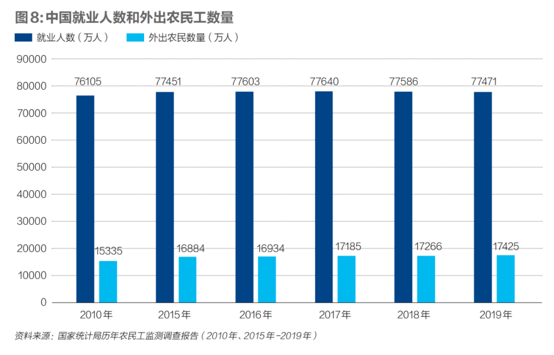 中国在经济高速增长时期,平均每年外出就业的农业转移人口多达2000万。但在2010年到2019年的十年间,仅新增农业转移人口2100万,平均每年也就200多万人(见图8),显然增长速度在严重放缓。这说明,中国的新增就业岗位有限,同时农村还有2亿的过剩劳动力尚未转移出来。在这种情况下,年龄较大人口的就业形势依然严峻。