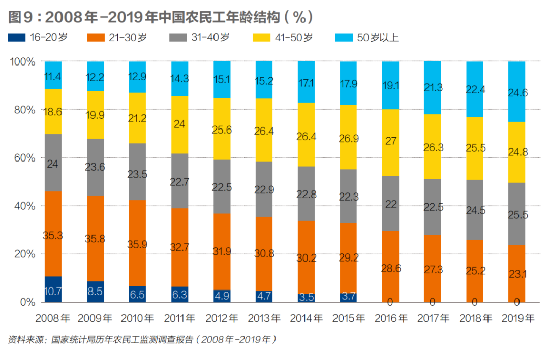 而在中国,仅从农民工年龄结构中就可以看到,50岁以上的占比从2008年的11.4%增加到2019年的24.6%(见图9)。