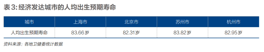 20世纪上半叶,因为长期战乱,中国人均预期寿命约35岁,一直到上世纪60年代末期,才提高到不到60岁。再到上世纪八九十年代,中国的人均预期寿命达到并超过了70岁,目前的人均预期寿命已经接近80岁(见图3)。而在经济发达的地区,人均寿命已经超过了80岁(见表3),可以说,我们已经步入了长寿时代。