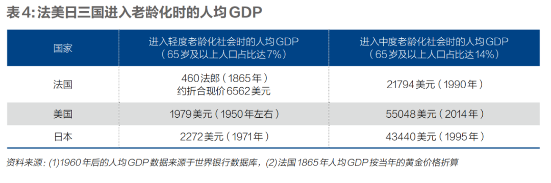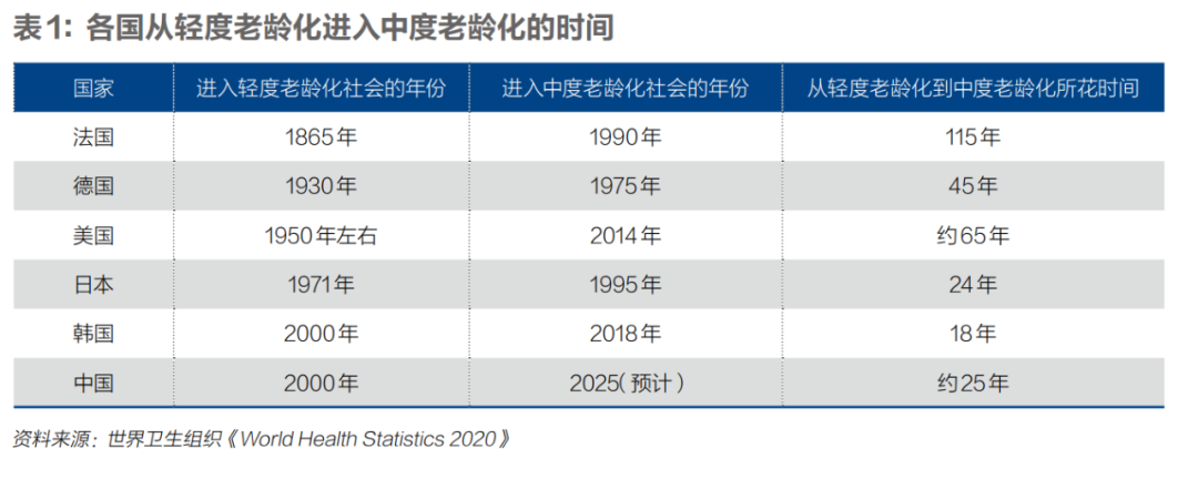 从进入老龄化社会的时间节点来看,中国在2000年已进入轻度老龄化社会,预计进入中度老龄化社会的时间为2025年。从轻度老龄化进入中度老龄化,法国花了115年,美国是65年,德国是45年,而日韩等两个东亚发达国家花费的时间和中国类似,日本是24年,韩国只用了18年(见表1)。除了老龄化的速度,中国与日韩的城镇化水平的提升以及经济增长速度也基本类似。