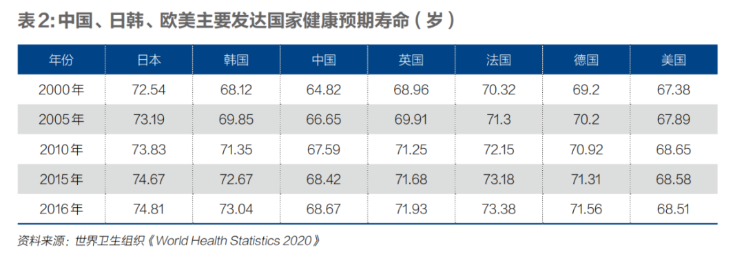 如果看健康预期寿命,中国已经接近发达国家水平,只是与日本还有一定的差距,与欧洲其他几个主要发达国家相比,仅仅差了不到3岁,同时基本与美国持平(见表2)。