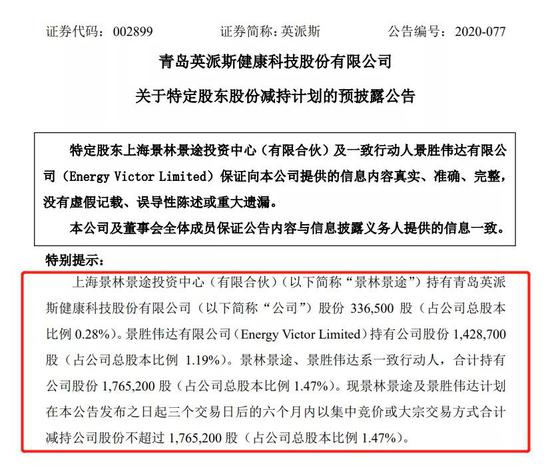 经查询英派斯在2017年6月报送的招股说明书,在英派斯上市前,景林景途及景胜伟达已经持有英派斯合计8,965,200股,占公司总股本的9.92%。其中,景林景途持有英派斯4,536,500股,占公司总股本的5.04%;景胜伟达持有英派斯4,428,700股,占公司总股本的4.92%。分别位列上市前英派斯股东的第五和第六位。