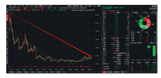 截至今日收盘,英派斯股价报14.67元,下跌2.2%。较三年前49.08元的高点,股价已经跌去70%。
