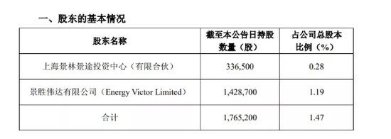 而根据公告显示,景林景途目前持有英派斯股份336,500股(占公司总股本比例0.28%);景胜伟达持有公司股份1,428,700股(占公司总股本比例1.19%)。另外,景林景途、景胜伟达系一致行动人,合计持有公司股份1,765,200股(占公司总股本比例1.47%)。