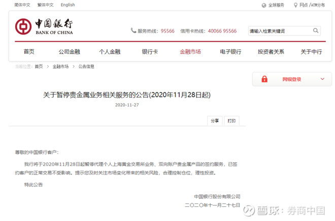 以中行为例,该行发布公告称:“我行将于2020年11月28日起暂停代理个人上海黄金交易所业务、双向账户贵金属产品的签约服务,已签约客户的正常交易不受影响。提示您及时关注市场变化带来的相关风险,合理控制仓位,理性投资。”