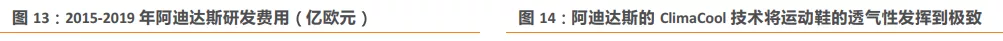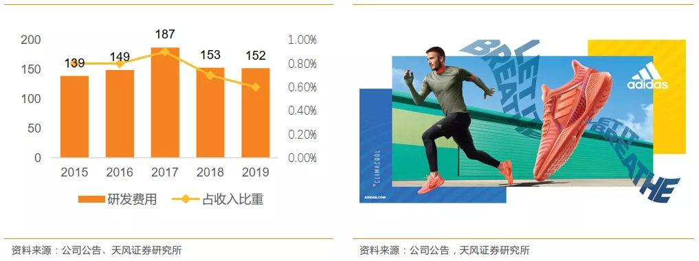 阿迪达斯在产品上的持续创新吸引了广大的运动员和运动爱好者,拥有多项业界领先的核心技术。同时,阿迪达斯自身也在不断进行研发产品的投入和合作,2017年阿迪达斯研发费用达到峰值1.87亿欧元,2018年研发费用达到1.53亿欧元,占净销售额的0.7%,2019年研发费用达到1.52亿欧元,占净销售额的0.6%