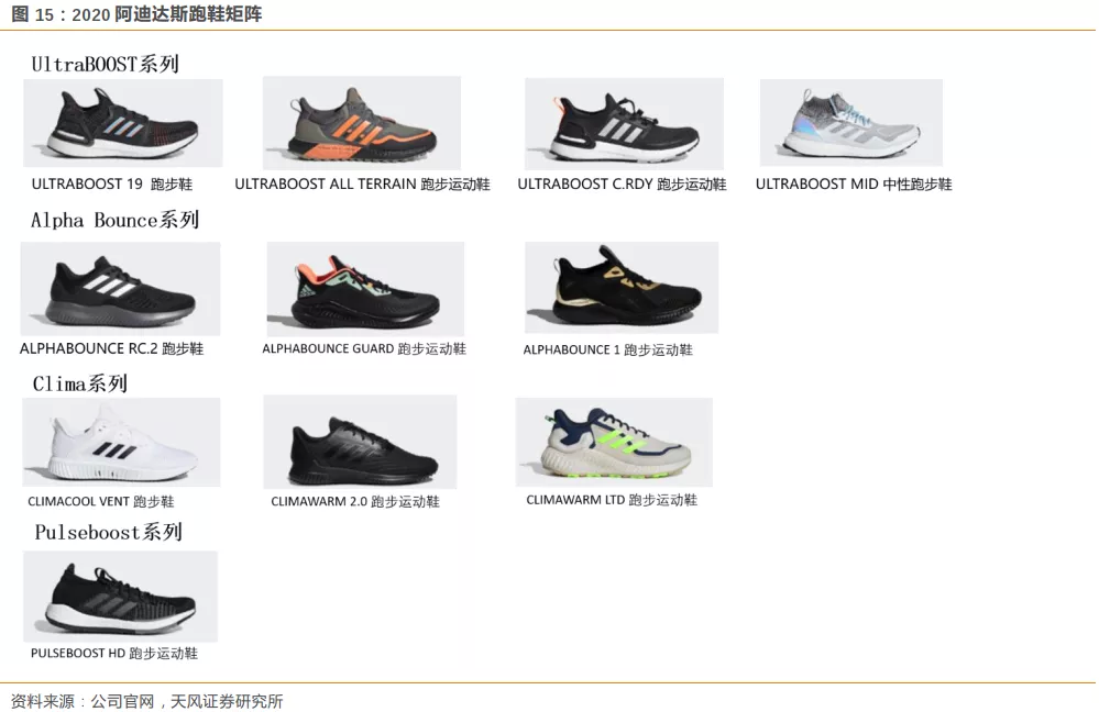 阿迪达斯品牌主要提供以下5个类别:跑步系列、训练系列、足球系列、篮球系列以及户外系列,训练系列包括训练鞋、训练服饰以及运动装备。同时公司专门设计为儿童以及其他特殊运动或休闲运动相关产品,如户外登山鞋、橄榄球、排球和其他户外运动。