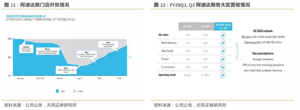 线上渠道逆势增长,逐渐成为稳定营收来源虽然FY2020Q1、Q2净销售额下降速度较快,但值得注意的是,电商渠道却在逆势增长,2020Q2电商渠道的增速达到93%,展现了公司持续在线上平台发力获得显著效果,如阿迪官网线上销售平台、淘宝天猫旗舰店、APP、短视频直播、等多元化线上渠道在卫生事件期间取得很好的效果,弥补了线下因为卫生事件带来的大面积关店带来的影响。